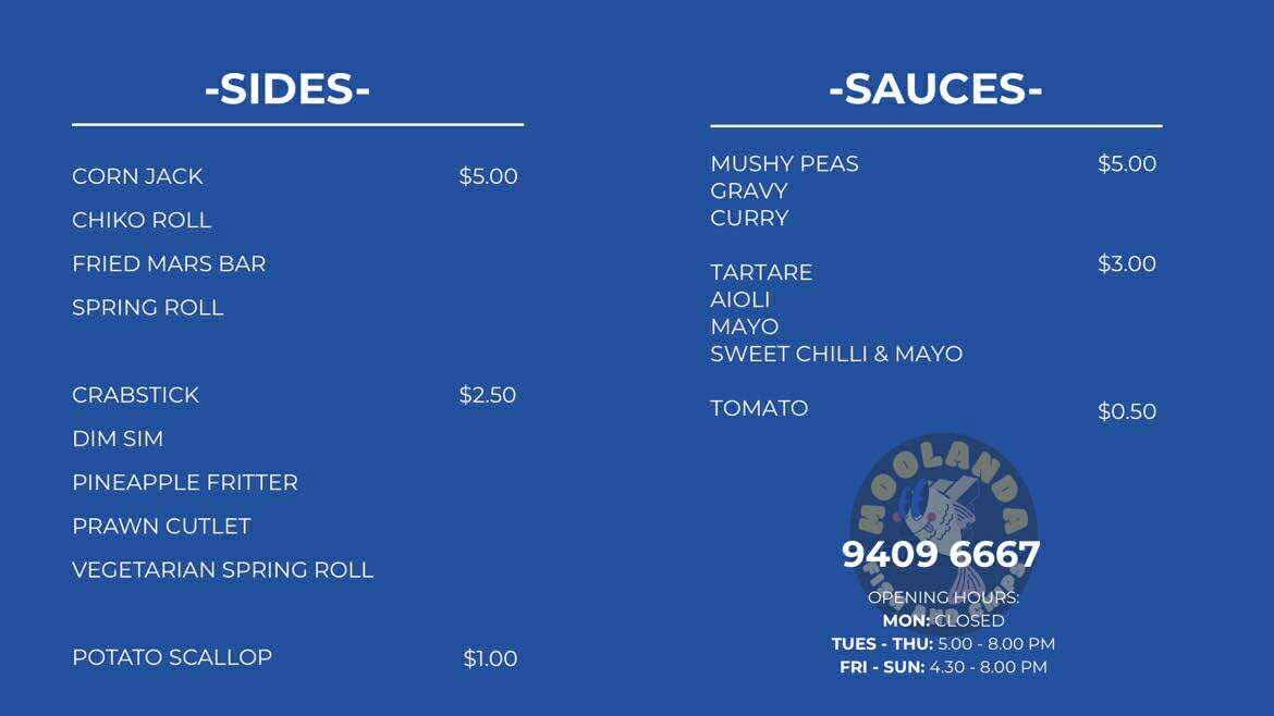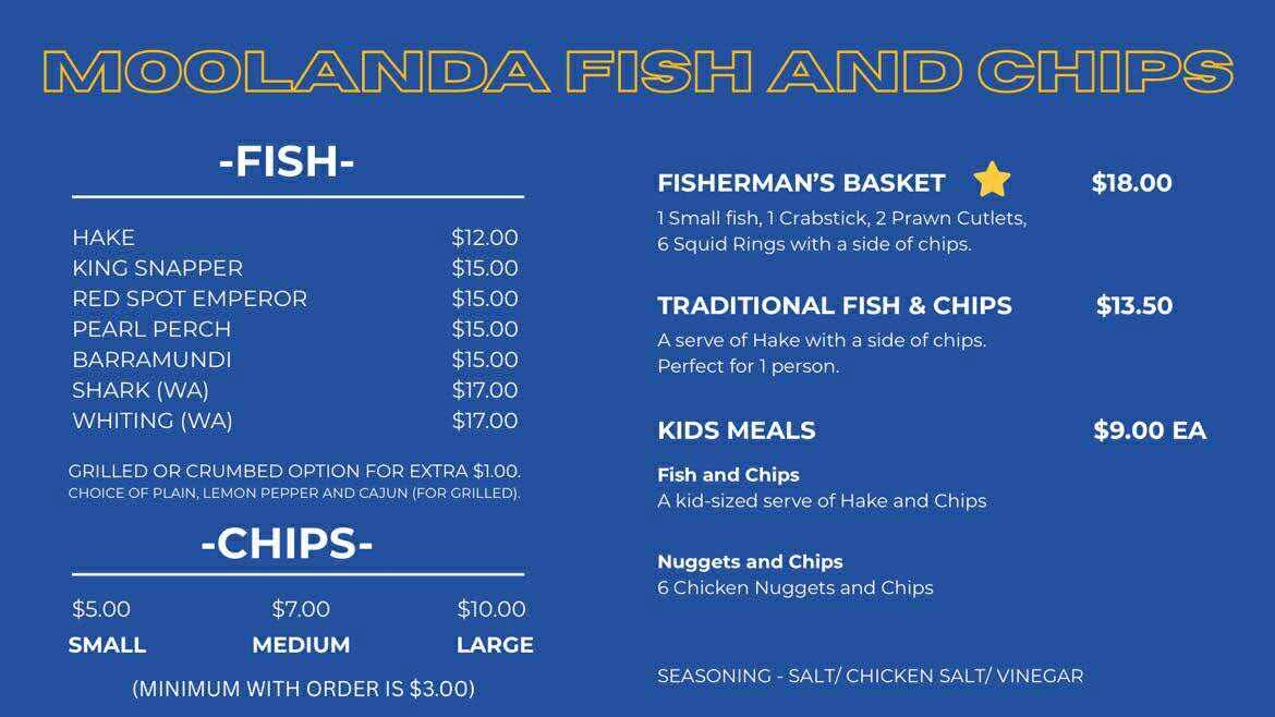 In summary, Moolanda Fish and Chips offers a diverse menu that caters to all tastes and preferences. Whether you’re looking for a quick snack, a meal for the family, or a traditional fish and chips experience, you’ll find something delicious to enjoy. The combination of fresh seafood, tasty sides, and generous portion sizes makes it a top choice for a satisfying meal in Kingsley.