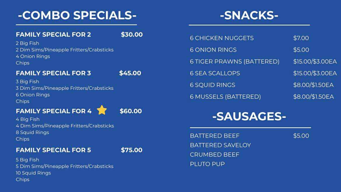 The restaurant also has some amazing Combo Specials, ideal for sharing with family or friends. You can opt for the Family Special for 2, Family Special for 3, Family Special for 4, or Family Special for 5 depending on your group size. These specials include a mix of fish, chips, and other tasty options, making it a great value for those looking to feed a crowd.